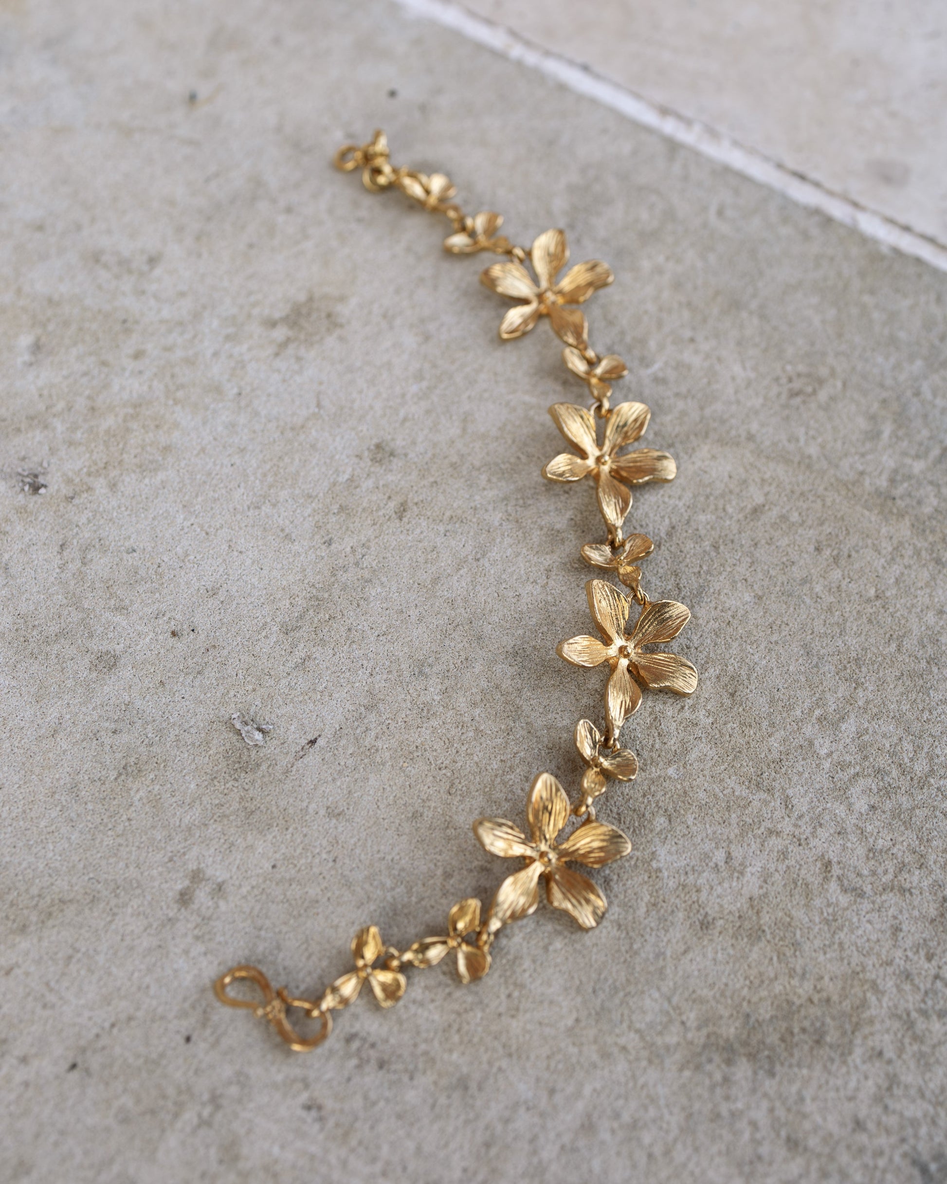 Brazalete bañado en oro con diseño floral. Ligero y cómodo, pensado para llevar a diario o como detalle en ocasiones más especiales.
