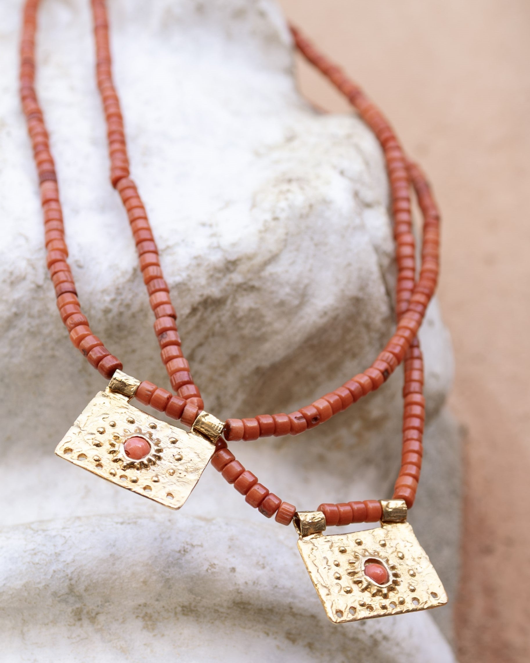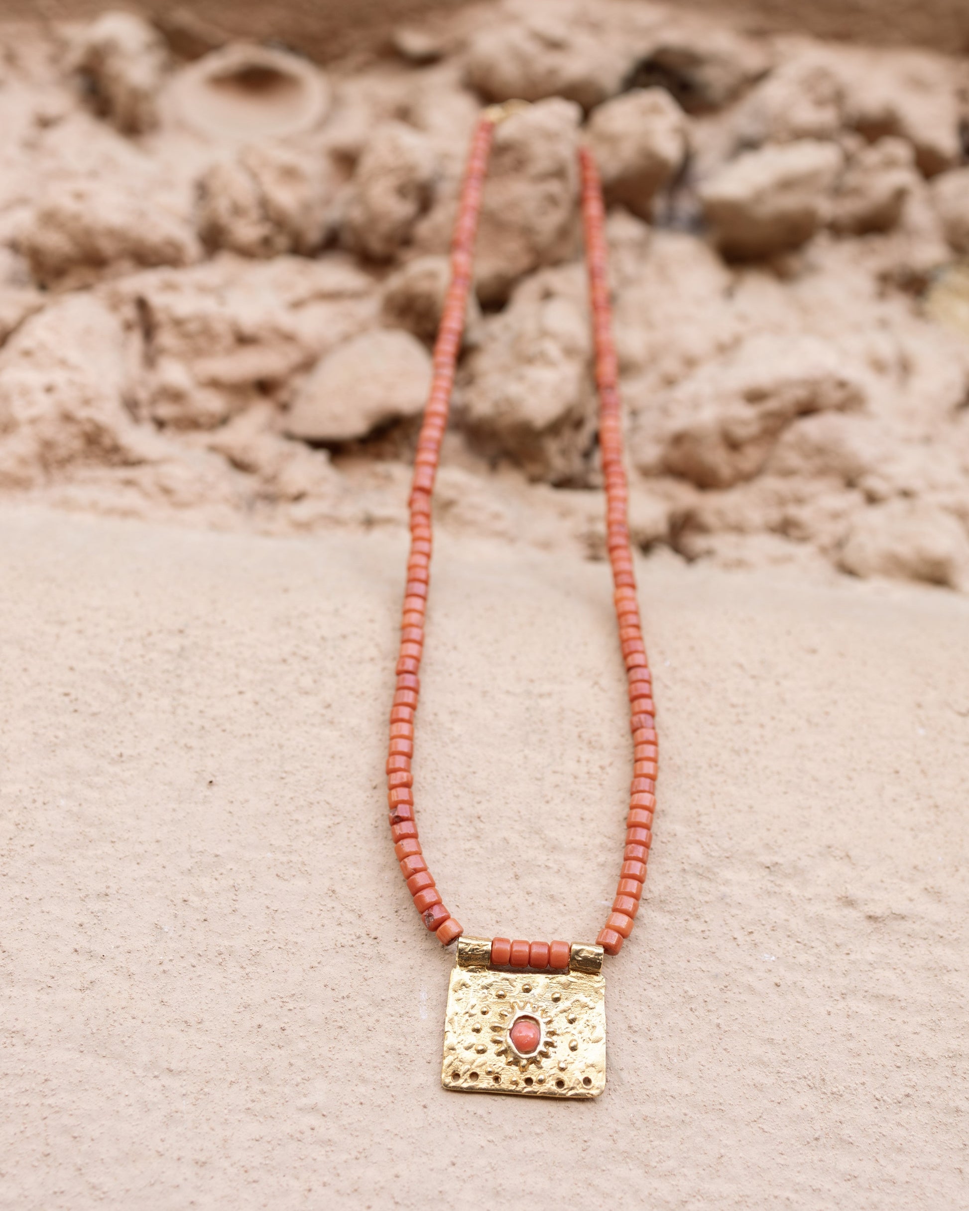 Collar de piedras naturales con colgante rectangular bañado en oro y textura irregular. Un diseño versátil y especial, perfecto para el día a día y fácil de combinar.